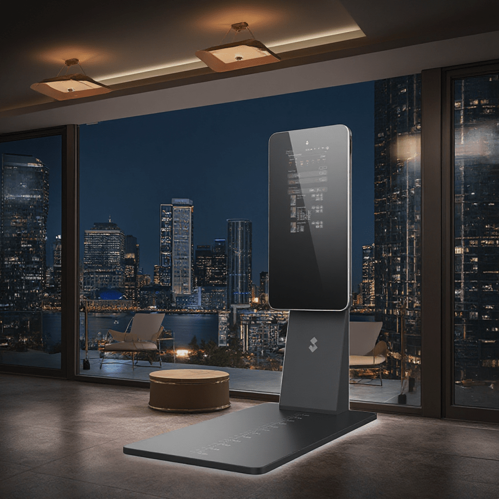 The device provides a space-efficient alternative to traditional gym equipment, offering guided workouts, form reference, and structured training in a single unit.
